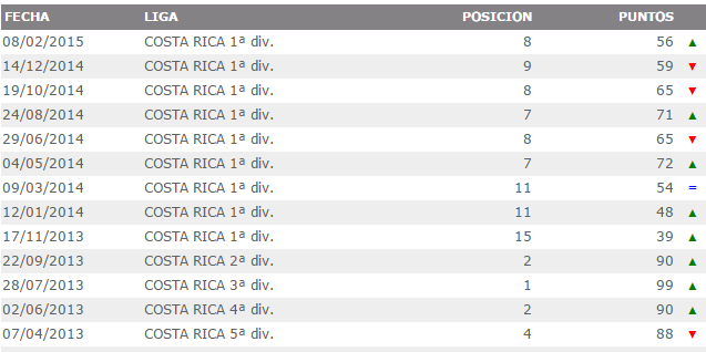 Aquí podrás ver la evolución del equipo en liga en toda su historia, indicando fecha, división en la que militaba, posición en esa división y puntos. Además indica con un icono si ha quedado en mejor, peor o igual posición que la temporada anterior.