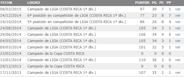 Aquí veremos un listado histórico de los resultados del equipo. Aparece la fecha del final de liga junto con la posición obtenida, la división en la que se encontraba, los puntos obtenidos y el balance de partidos ganados, empatados y perdidos. Además, si pinchamos en ver, nos mostrará la clasificación completa de esa temporada. Además, si el equipo queda campeón o subcampeón de copa, Intercopa o Interliga, también aparece en este histórico aunque en este caso no muestra el balance de victorias ni la competición completa.