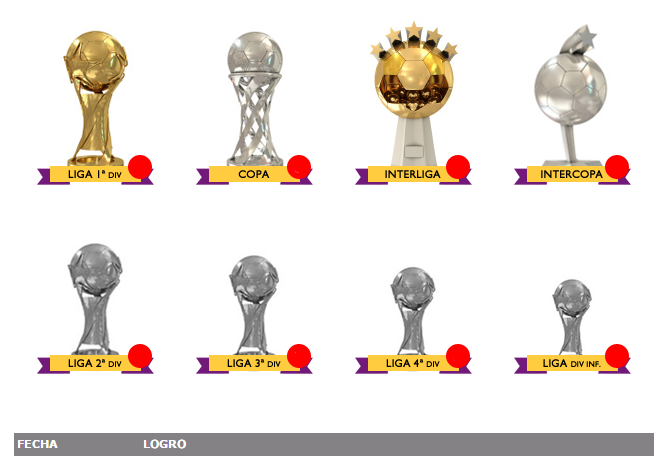 En esta sección sólo veremos los logros del equipo, es decir los títulos que ha conseguido en toda su historia. En la parte superior aparecen los trofeos de las diferentes competiciones oficiales y el número de veces que ha ganado cada uno (en el círculo rojo). En la parte inferior podremos ver la fechas en las que se obtubo cada logro.